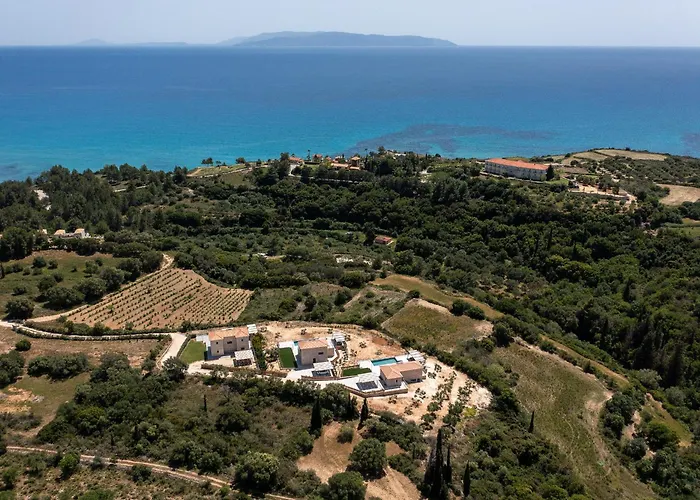 Die 4-Zimmer- Kefalonia Stone Villas - Villa Petros Kefalonica Trapezaki liegt in rund 25 Gehminuten Entfernung vom Strand von Pessada und verfügt über eine Terrasse, von der aus man einen Küsten- Blick aufs Meer hat.